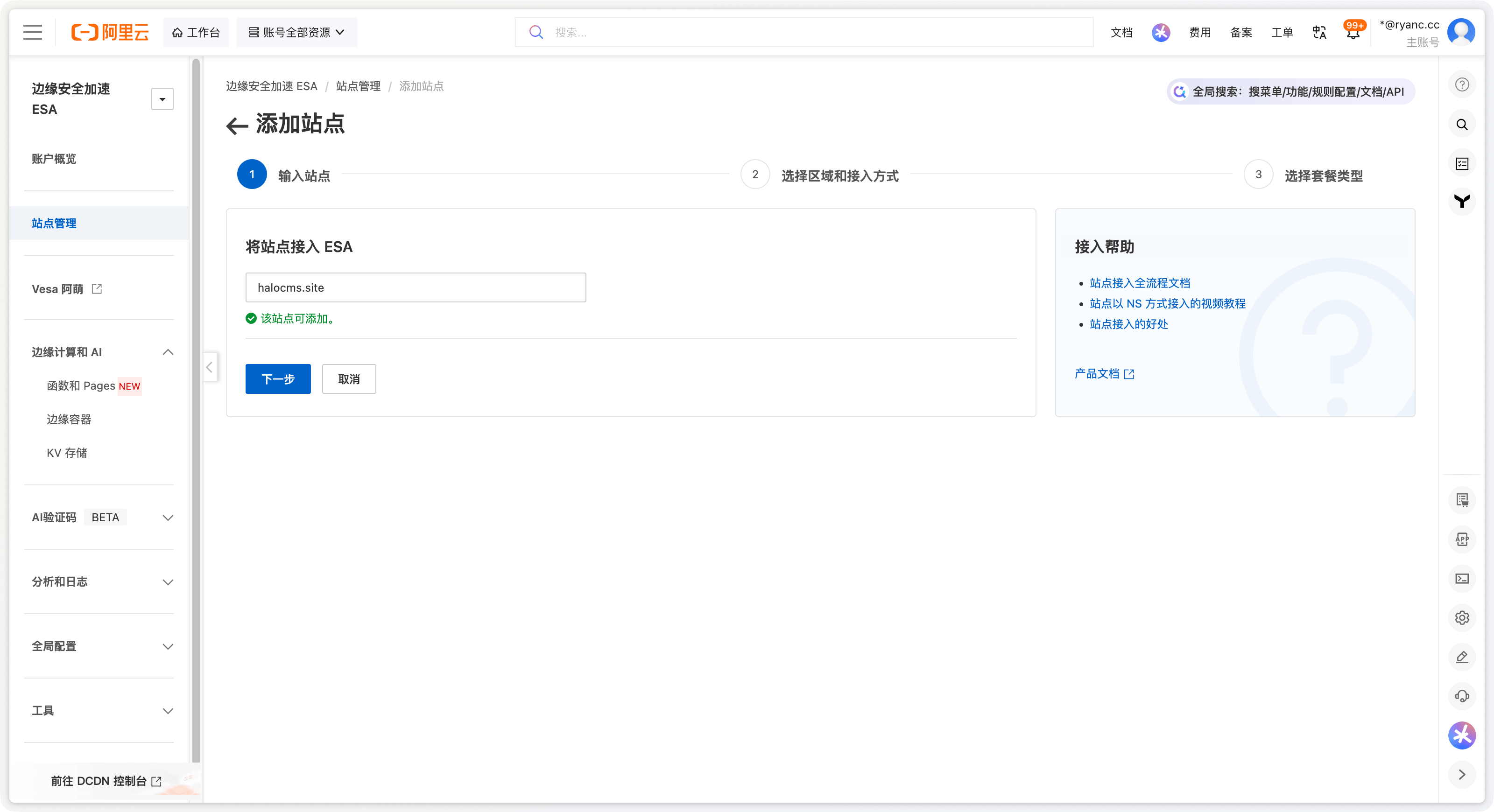 访问 阿里云 ESA 控制台,首次使用需要开通服务。开通后点击添加站点。