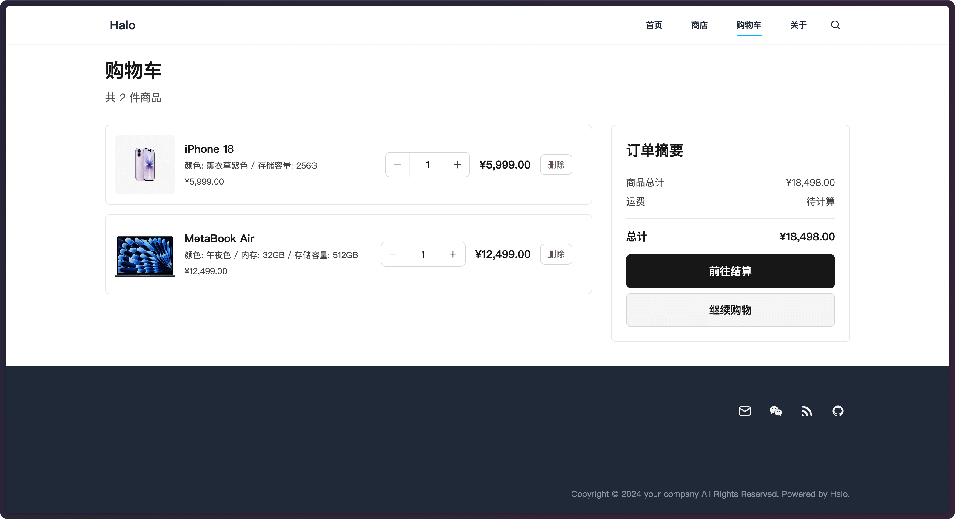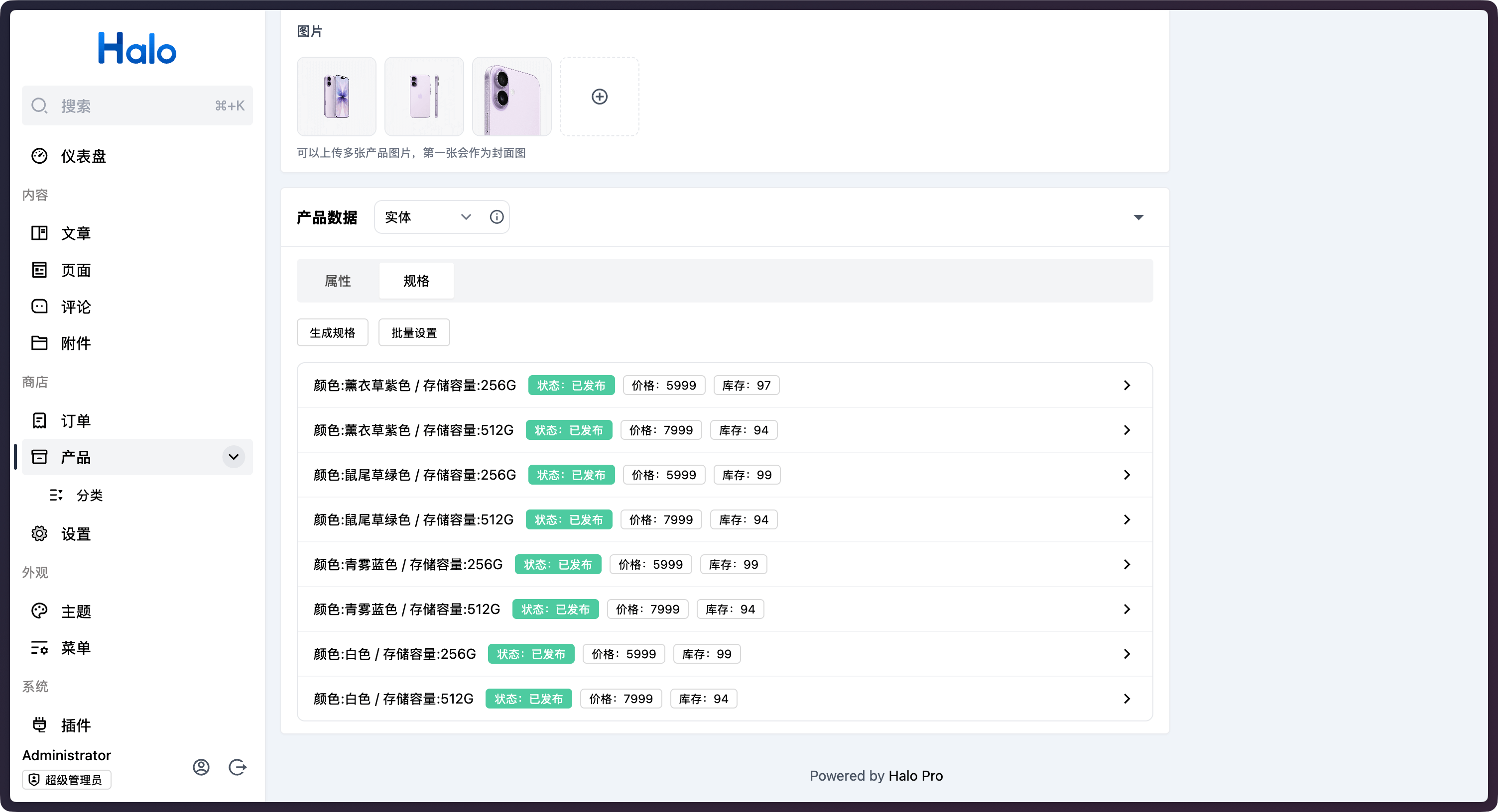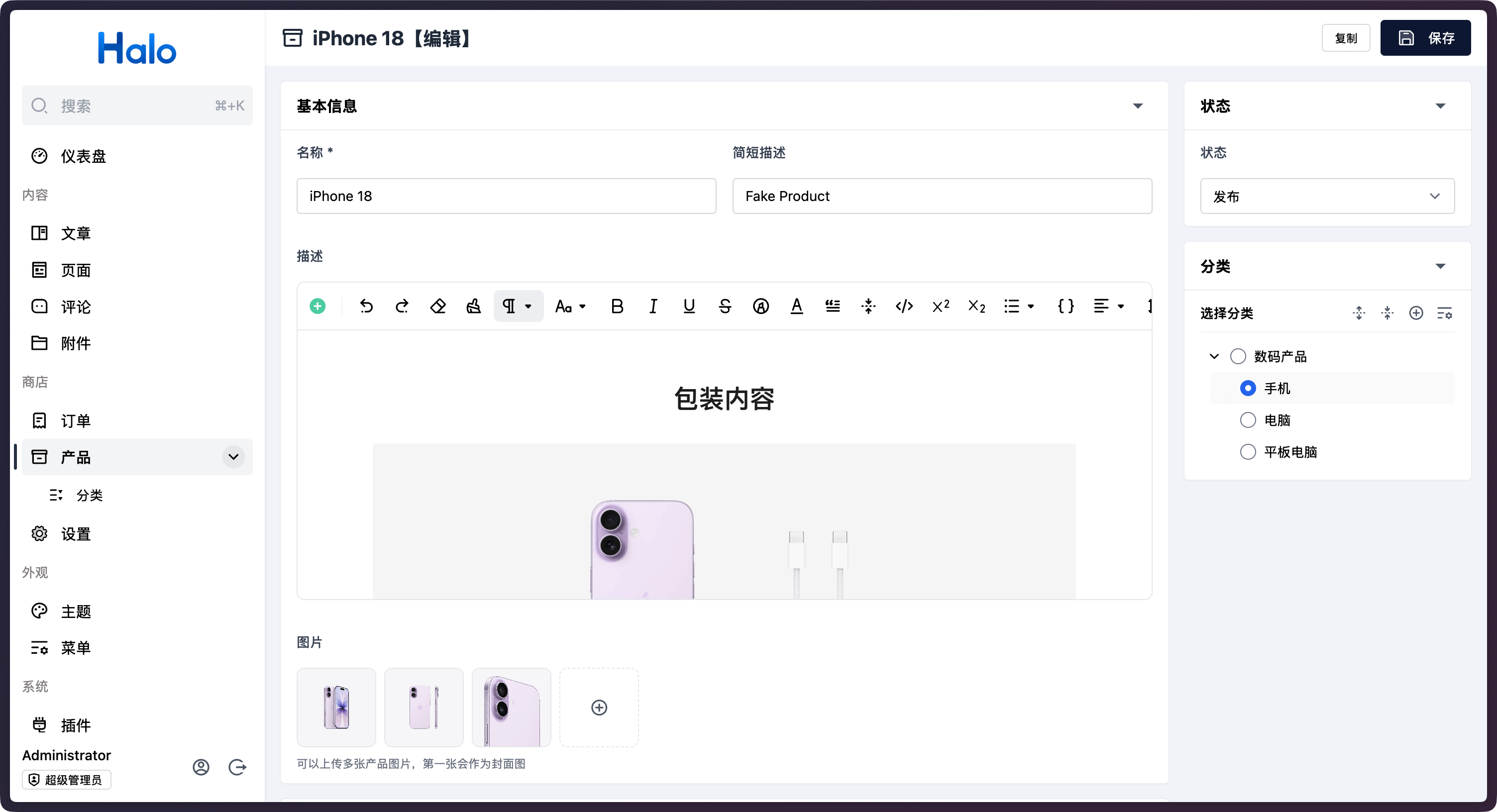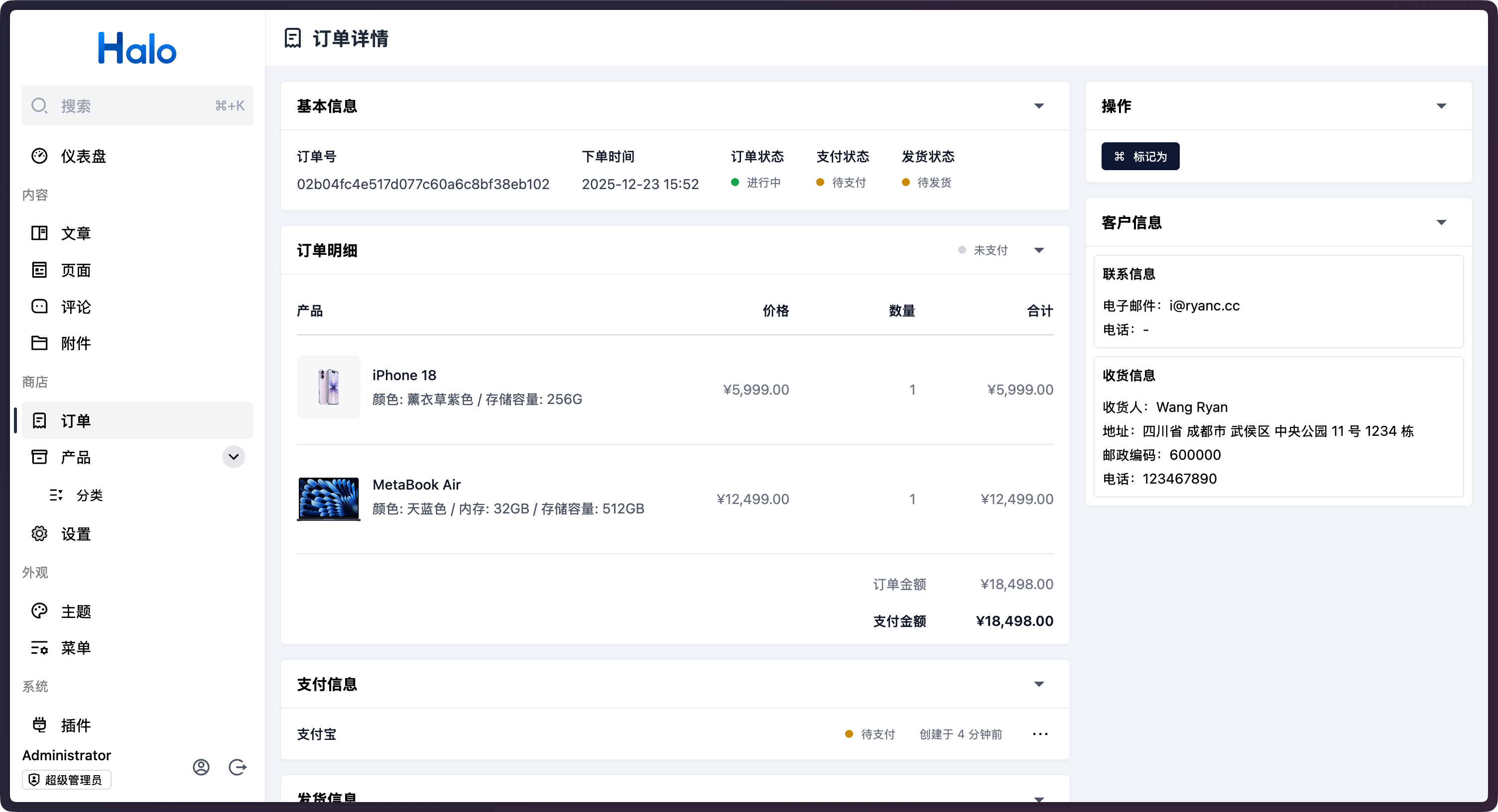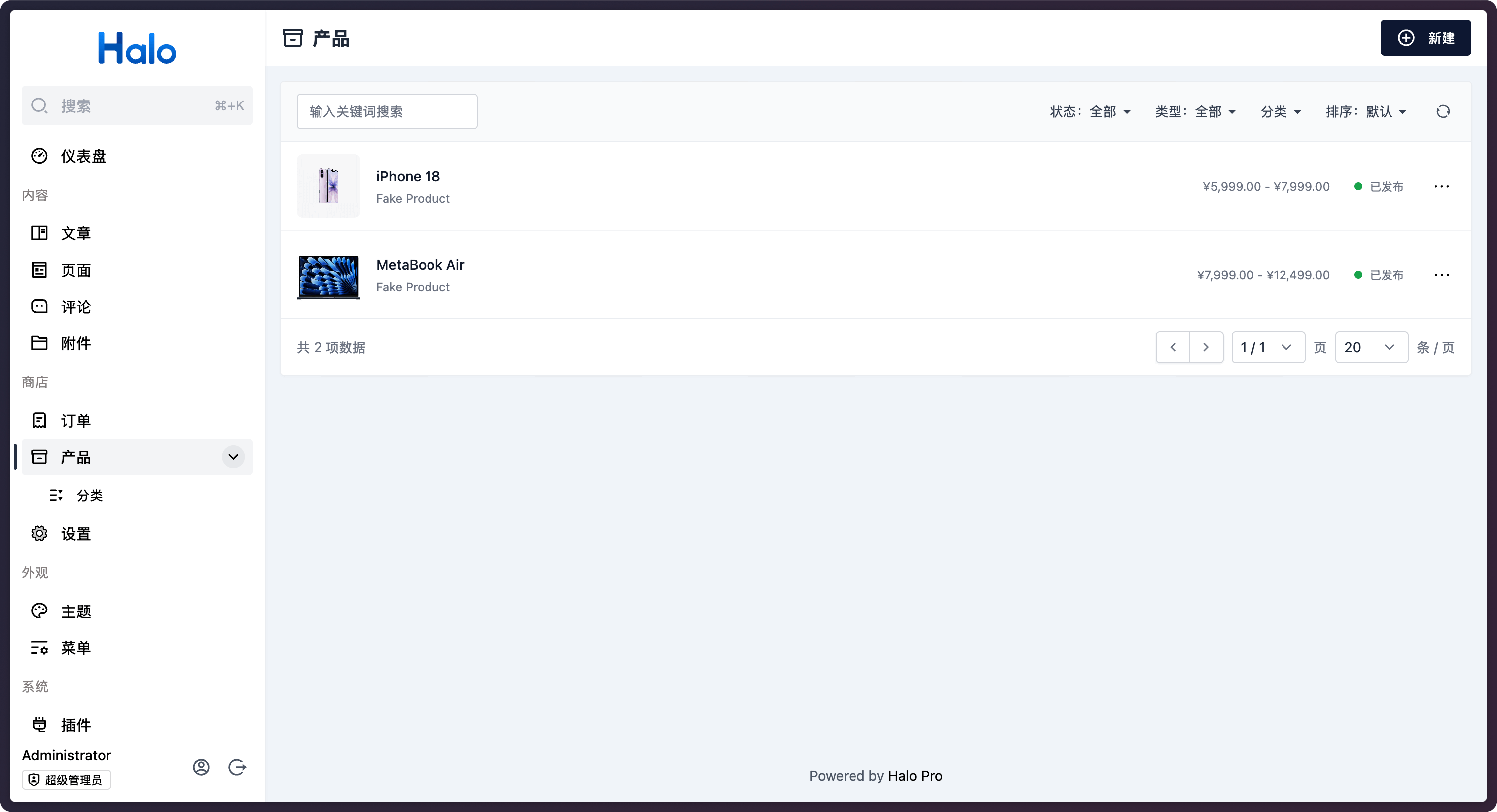 随着 Halo 2.22 的发布,我们同时上线了 Halo 商业版,Halo 商业版在 Halo 专业版的基础上增加了商城功能模块。支持用户基于 Halo 站点创建店铺,上架多种类型的货品与商品支付、商品发货方式。为实体商品、虚拟商品、链接商品等销售场景提供完备的电商解决方案。