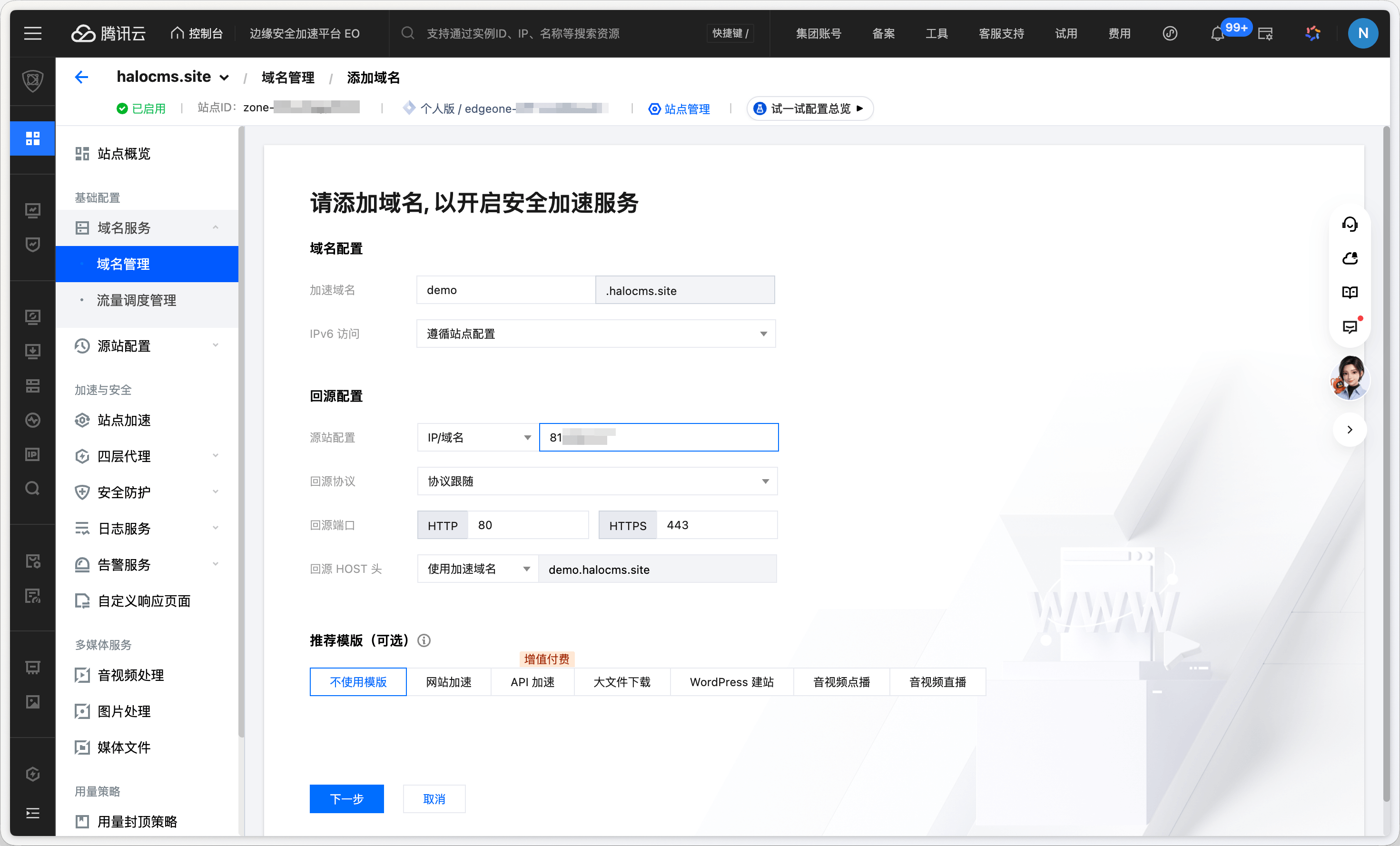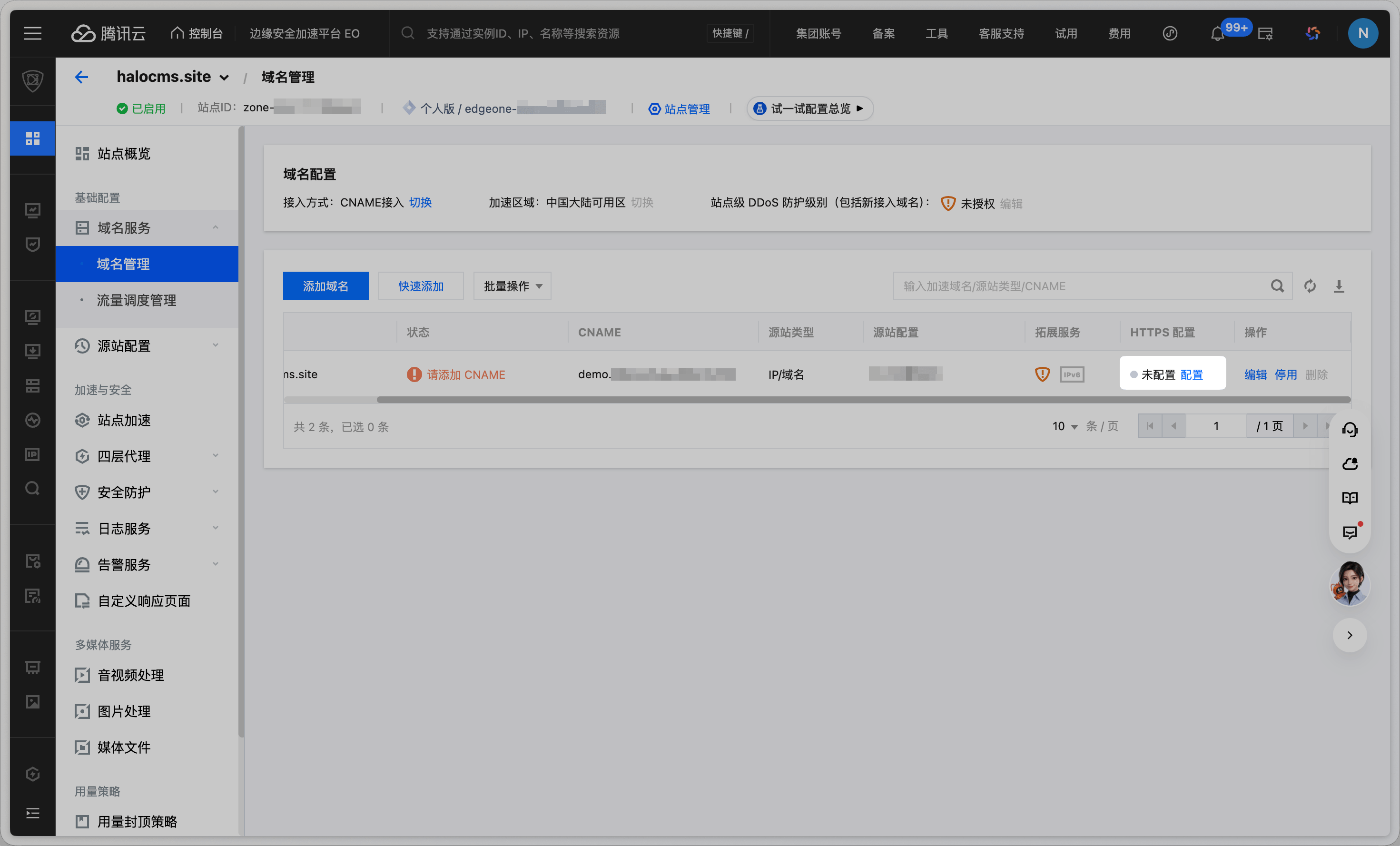 站点接入完成后,建议在 加速与安全 → 站点加速 中按以下说明调整配置,以获得更好的加速效果并确保 Halo 功能正常。