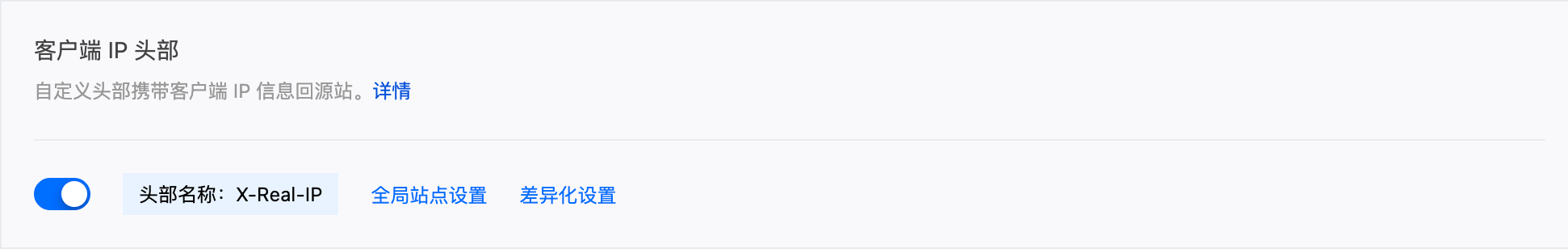 开启后,EdgeOne 会将访客的真实 IP 通过请求头传递给源站。头部名称设置为 X-Real-IP,这样 Halo 才能正确记录访客的真实 IP 地址,而不是 EdgeOne 节点的 IP。