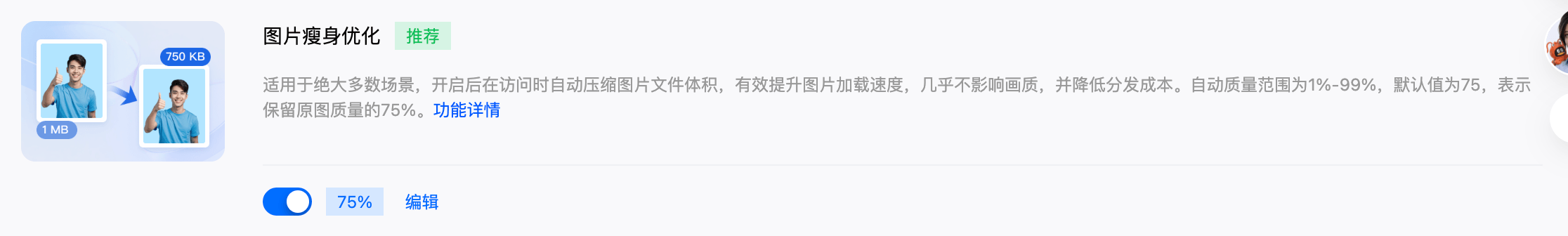 图片瘦身优化:自动压缩图片体积,默认质量为 75%,几乎不影响视觉效果,可有效提升图片加载速度