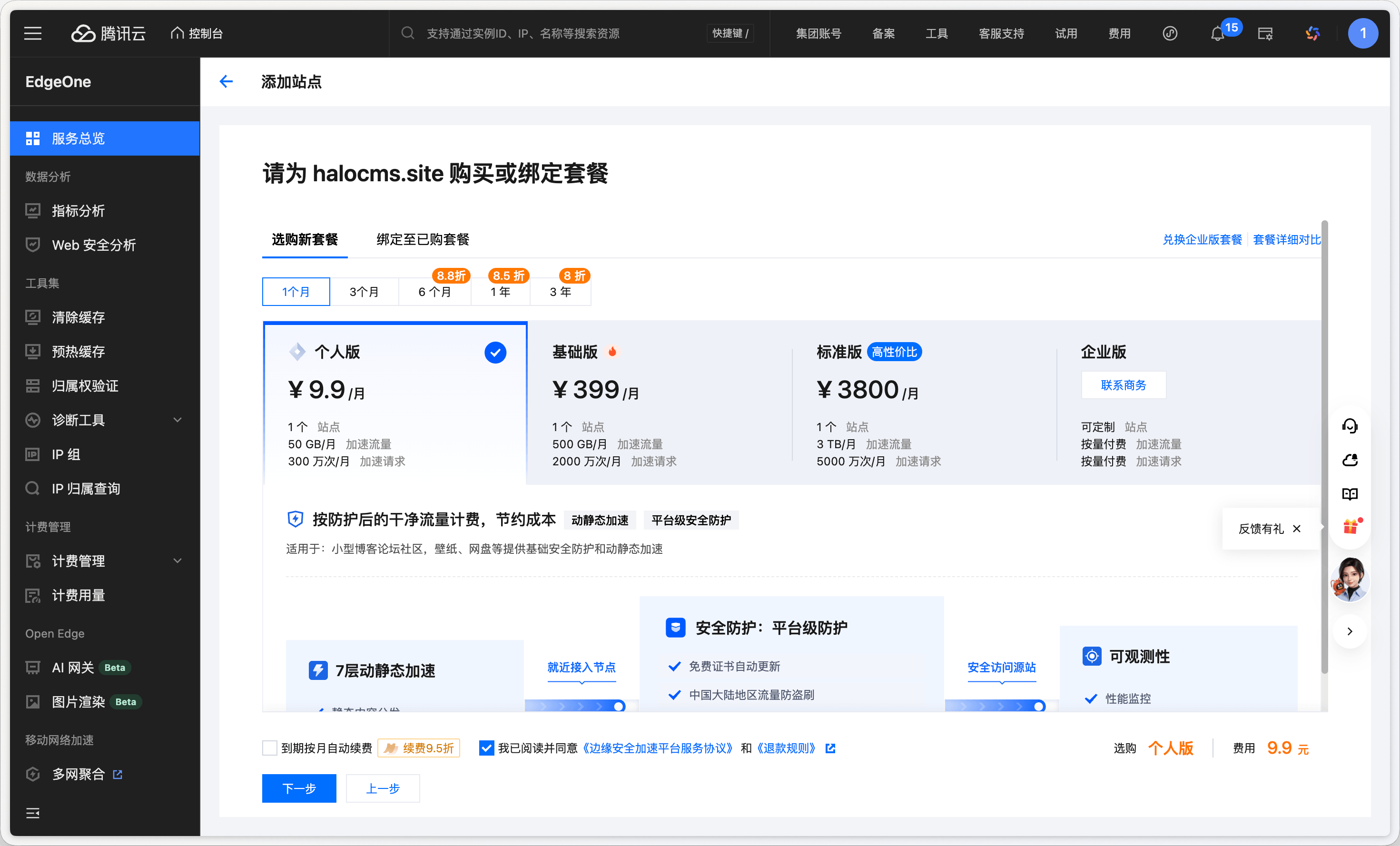 根据你的流量规模和功能需求选择合适的套餐。个人博客或小型站点可以从个人版开始,按需升级。选择后勾选服务协议,点击下一步。
