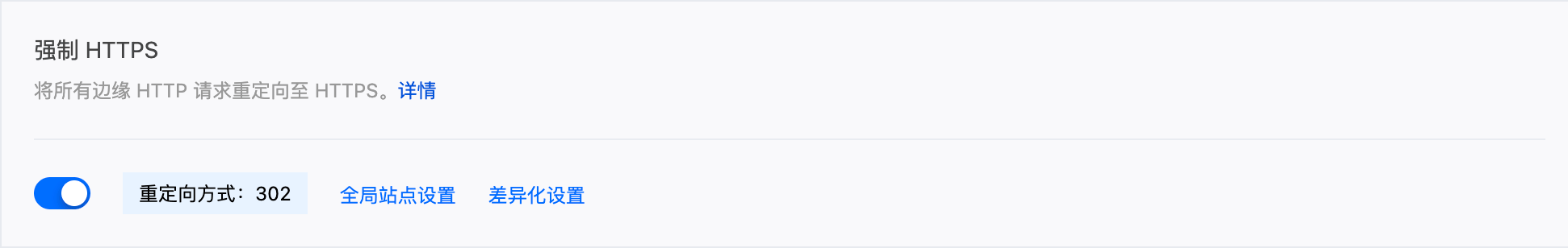开启后,所有 HTTP 请求会被自动重定向到 HTTPS。建议在 HTTPS 证书配置完成后开启,重定向方式选择 302 即可。