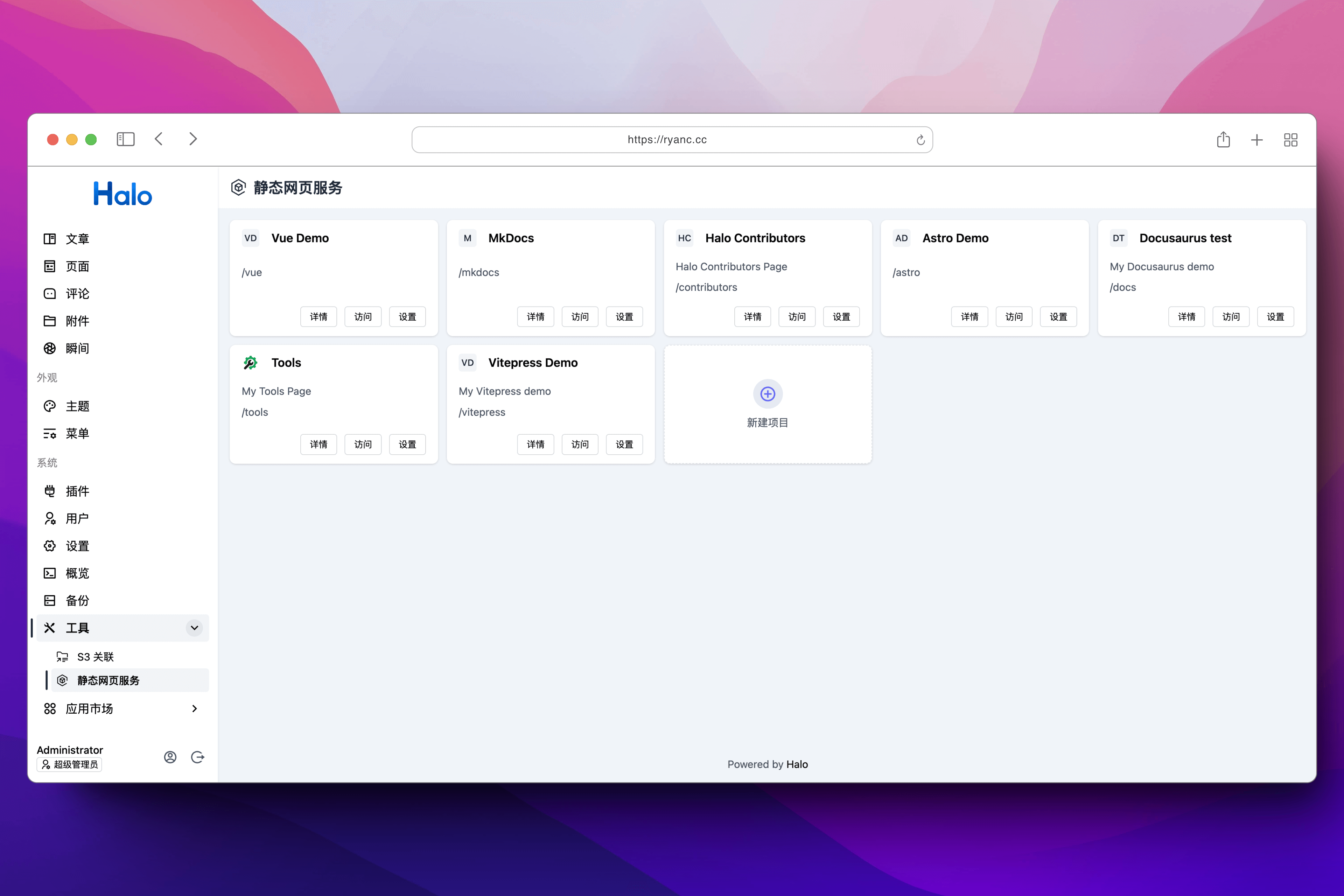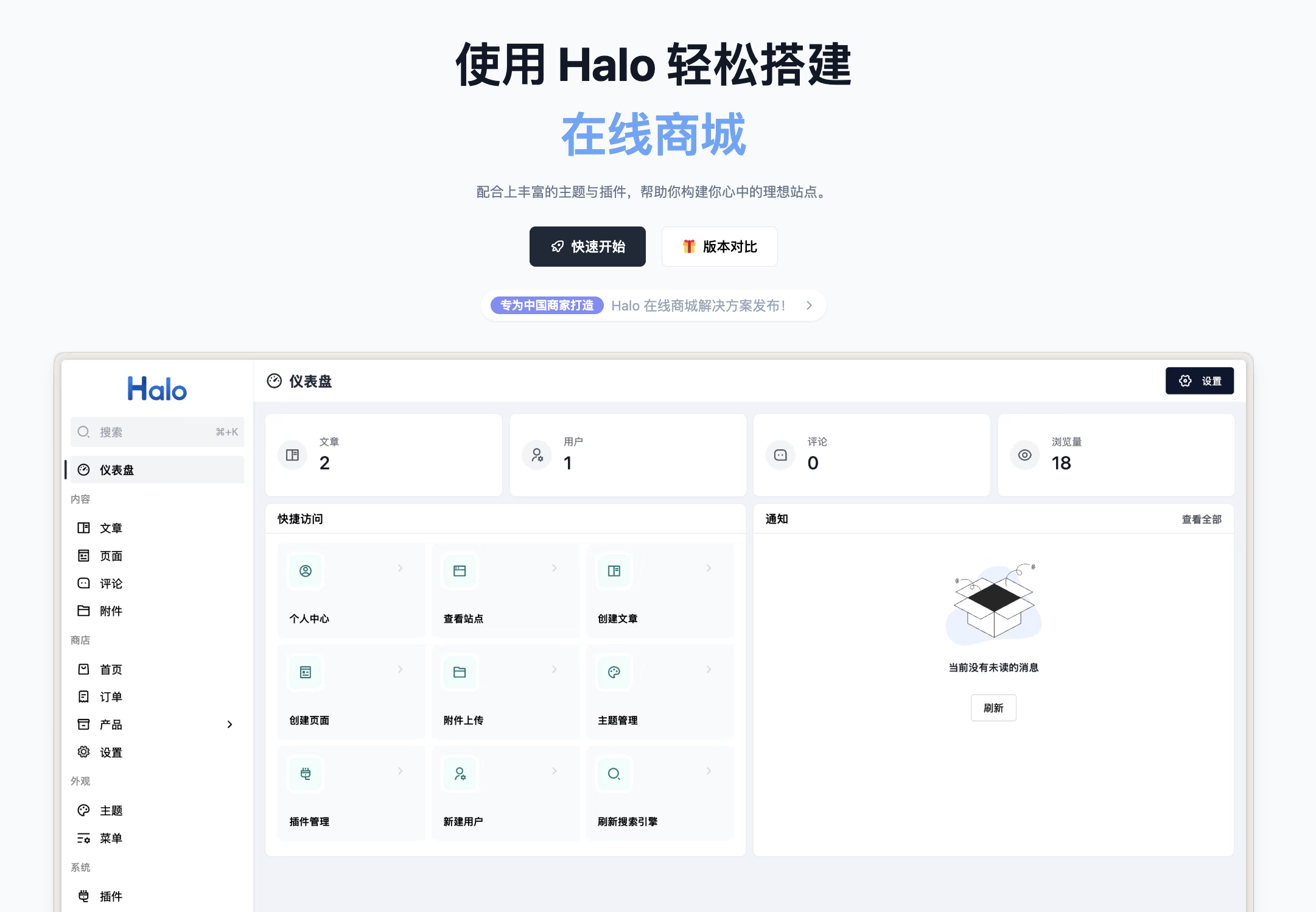 静态网页插件负责托管 HTML/CSS/JS。但 Halo 本身是一个完整的建站系统,你可以同时用它写博客、搭建知识库、甚至做企业官网。