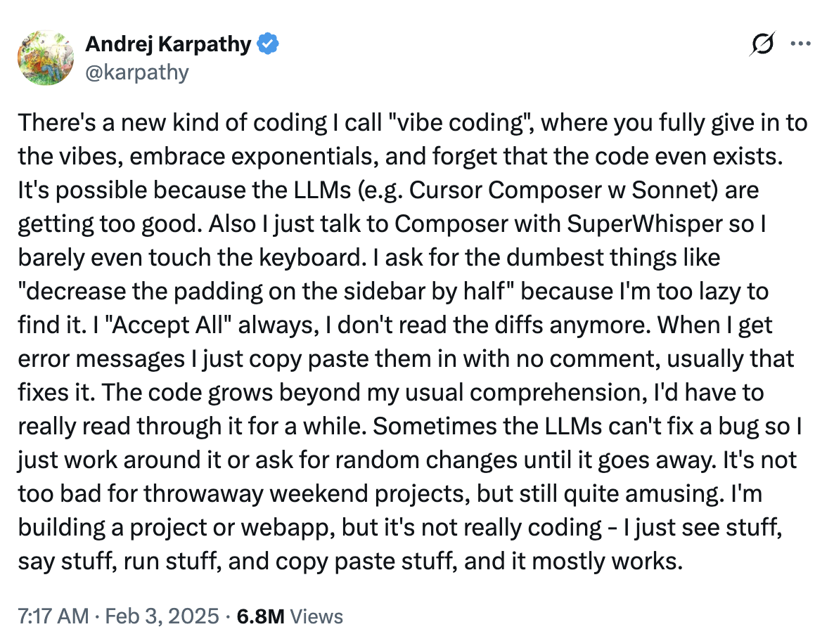去年 Andrej Karpathy 随手发了条动态,说自己写代码全靠自然语言描述需求、让 AI 生成一切,管这叫 Vibe Coding。一年多过去,这个词早已不需要解释了——用 Cursor、Bolt、Claude 写代码已经是很多人的日常,小红书上"零基础用 AI 做了个网站"的帖子多到没人会再觉得稀奇。