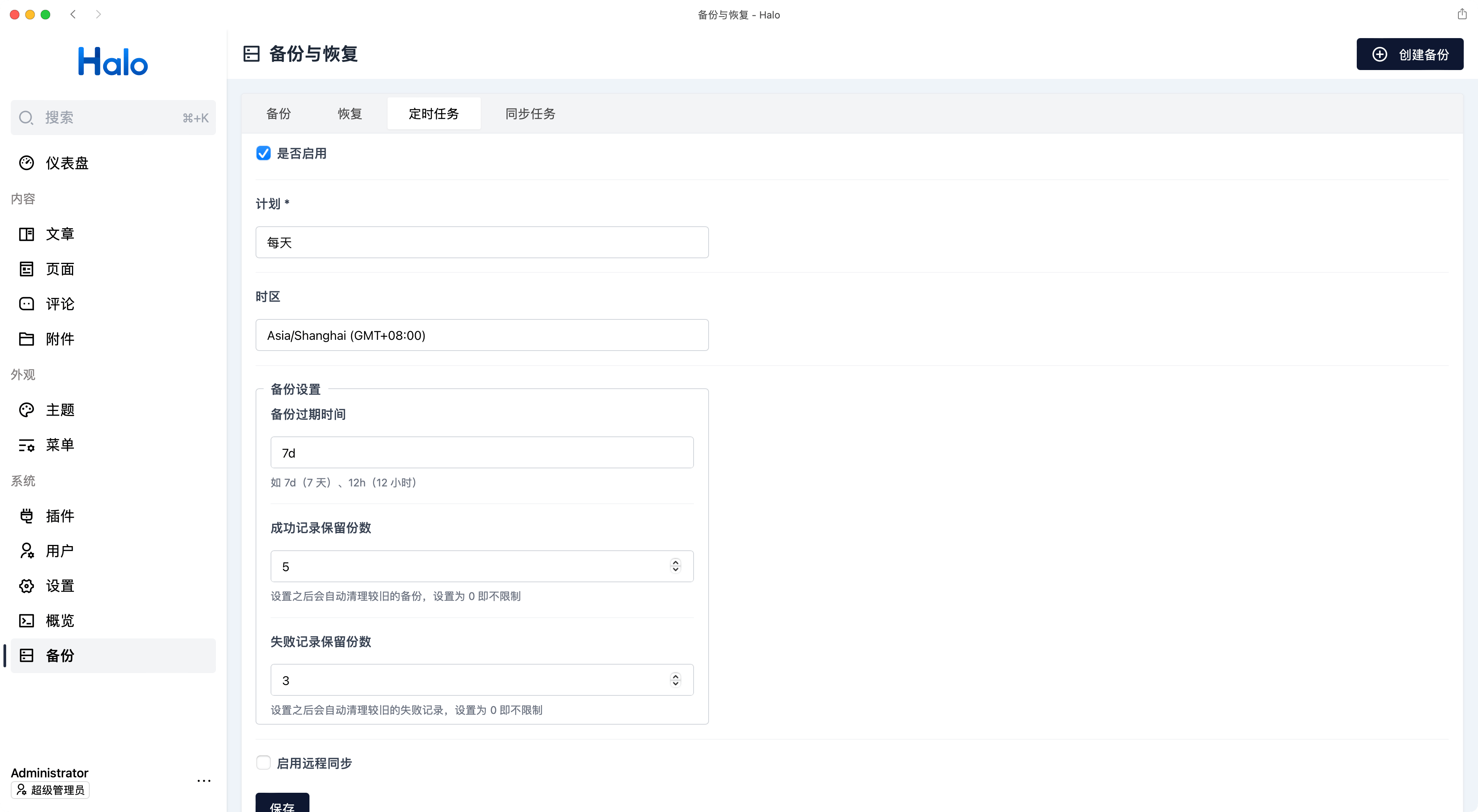 定时任务:提供定时任务的配置表单,包括远程同步的相关配置。