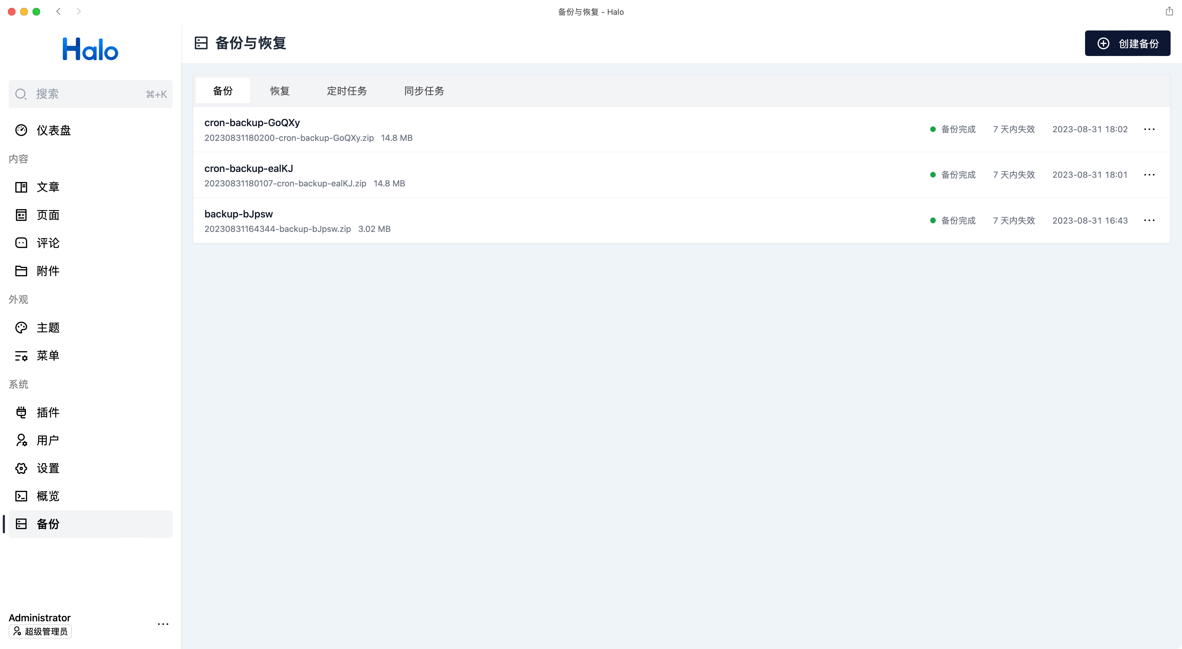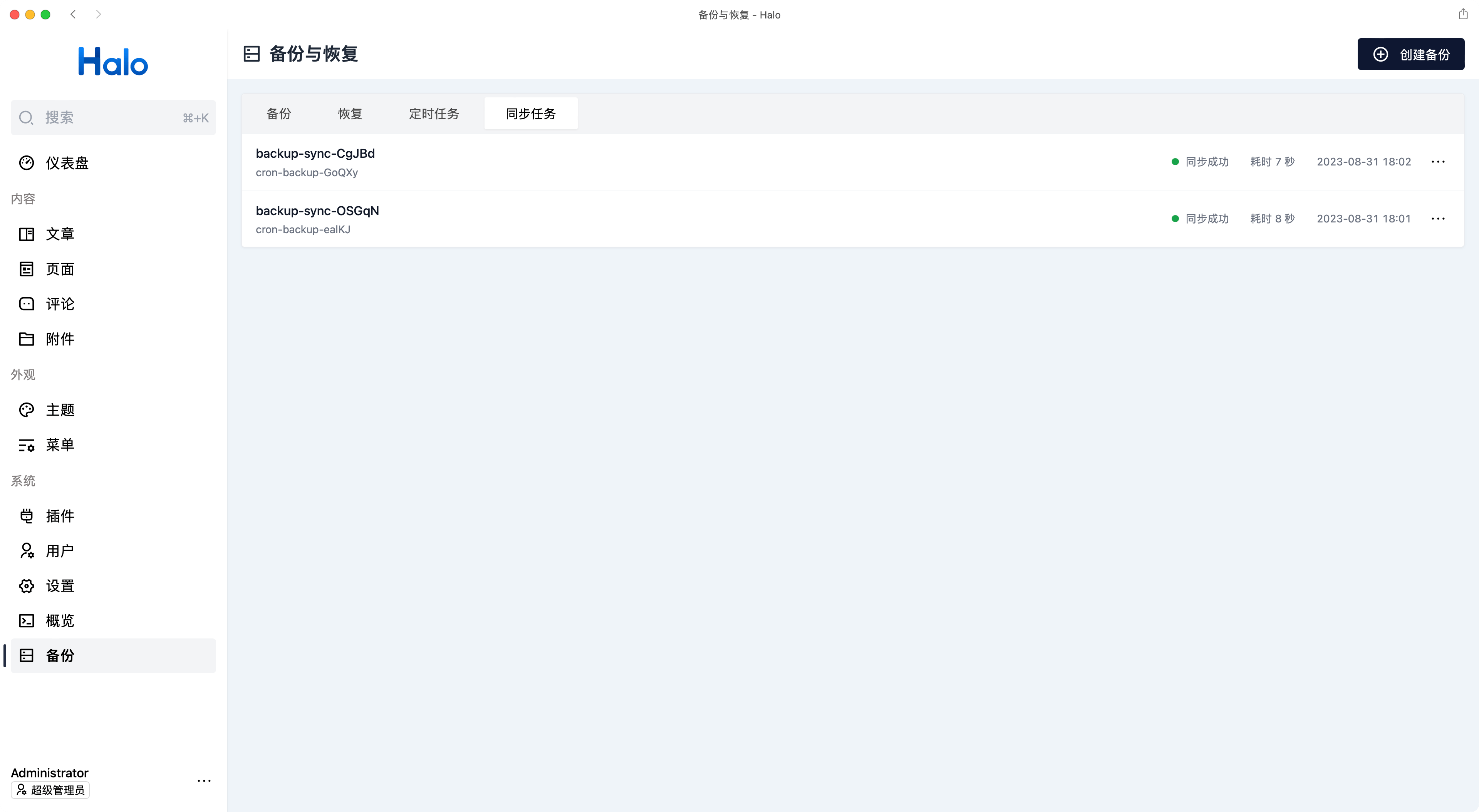 安装好插件之后,进入备份页面即可看到新增的 定时任务 和 同步任务 的选项卡,它们的作用为: