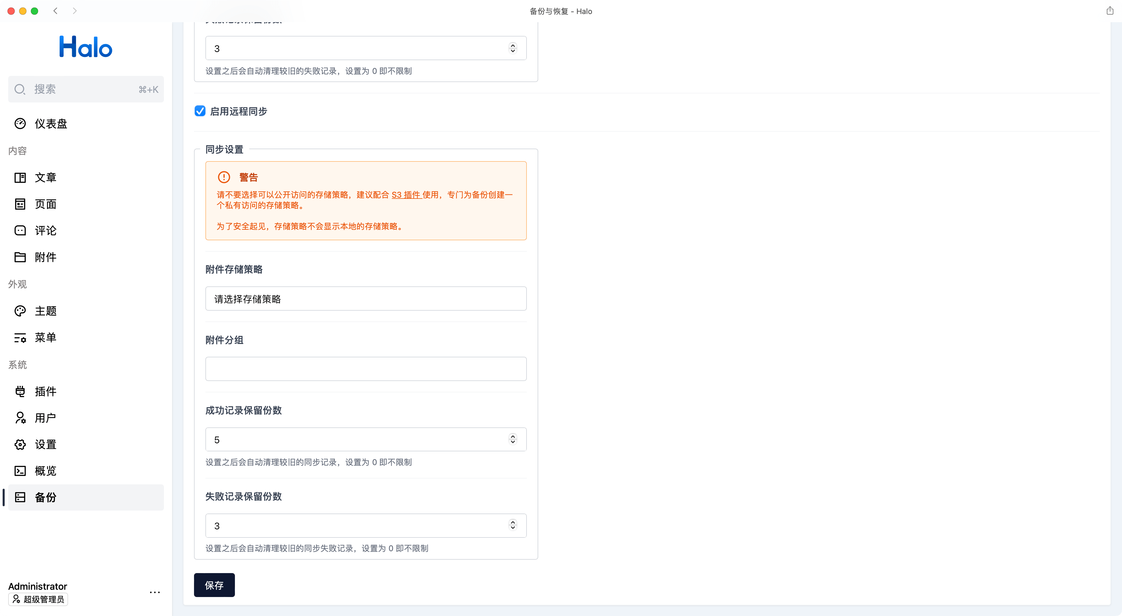 附件存储策略:同步的位置,需要先创建一个新的附件存储策略。推荐使用 S3 插件 配置一个远程且私有的存储策略,为了安全起见,此选择框不会列出类型为本地的存储策略。