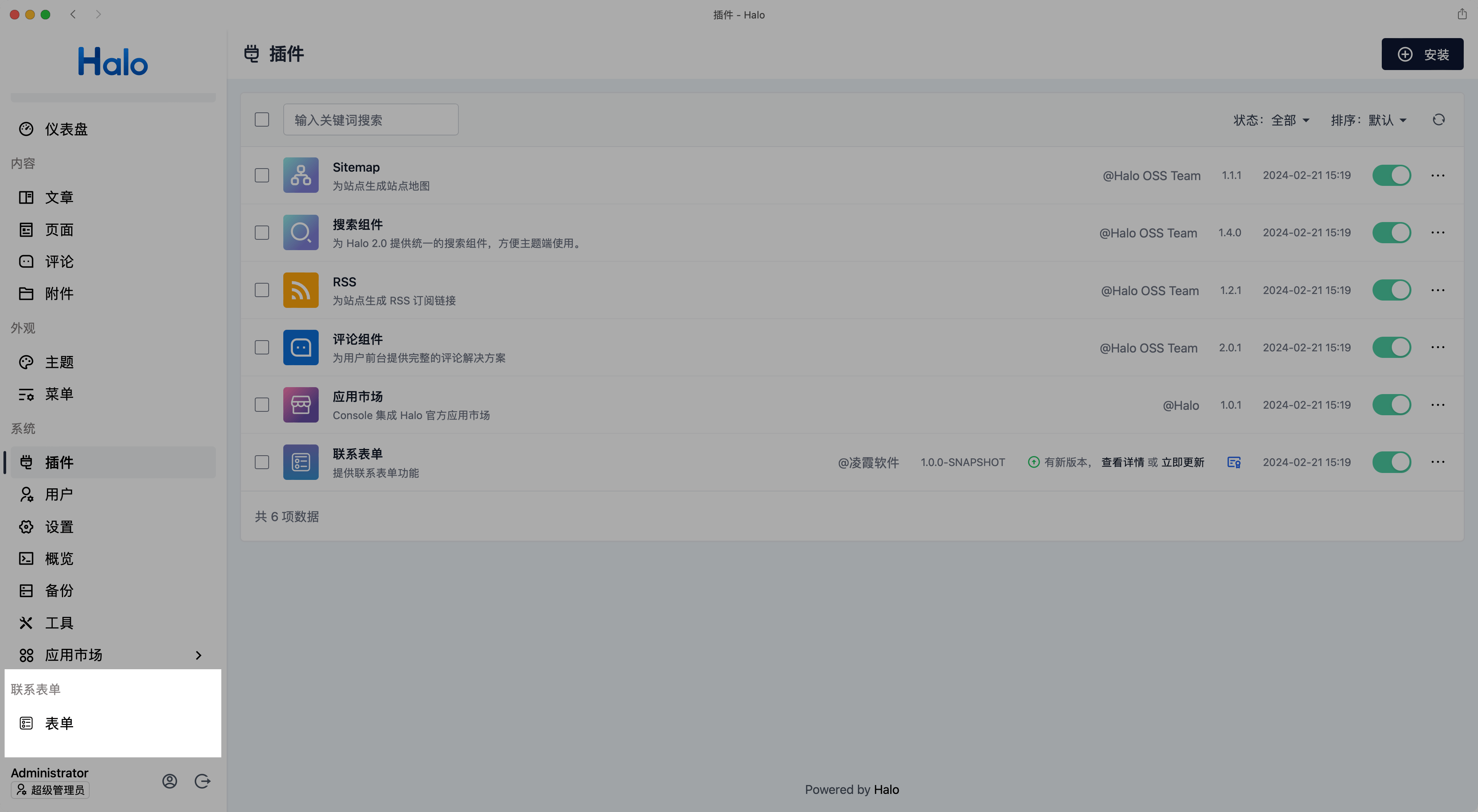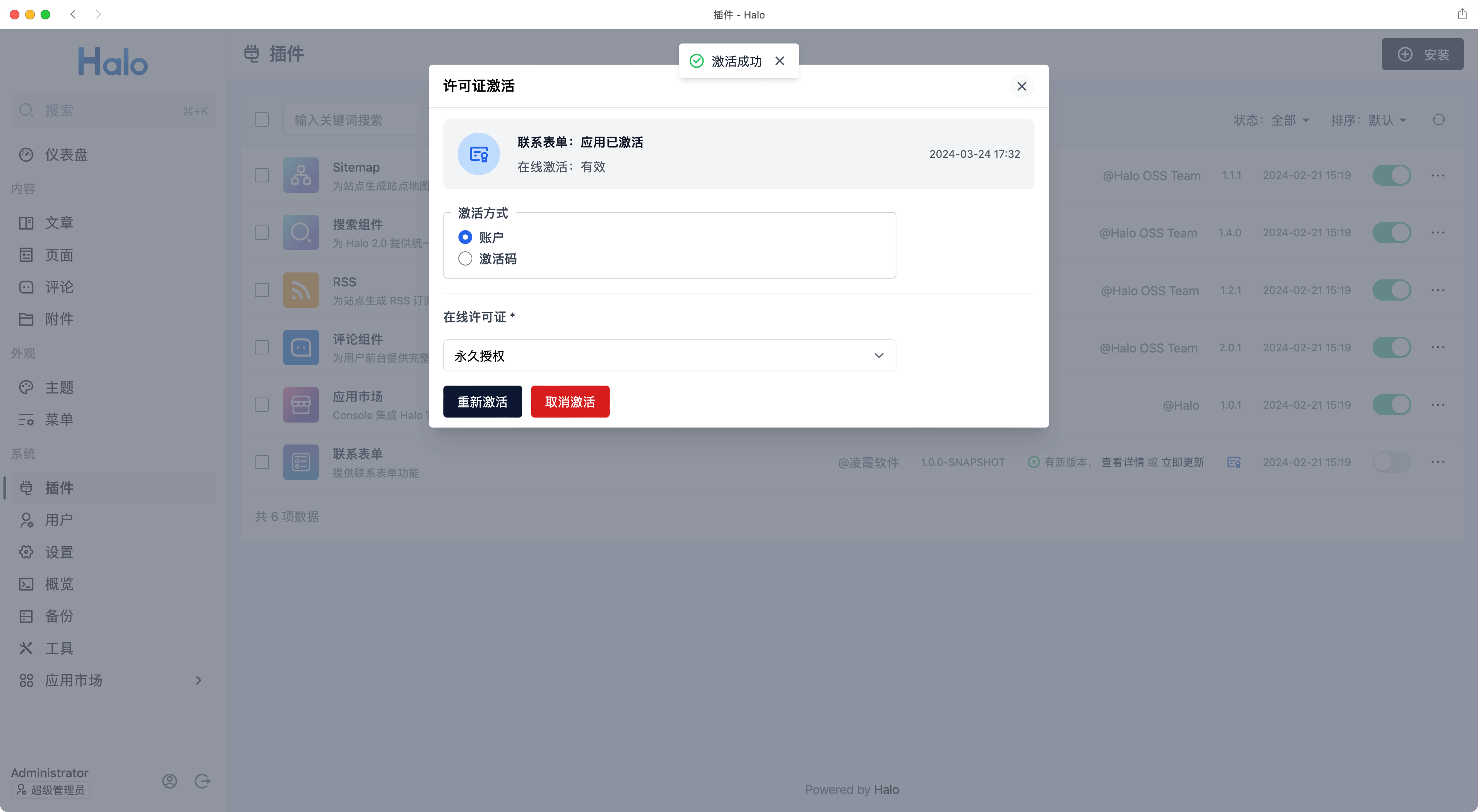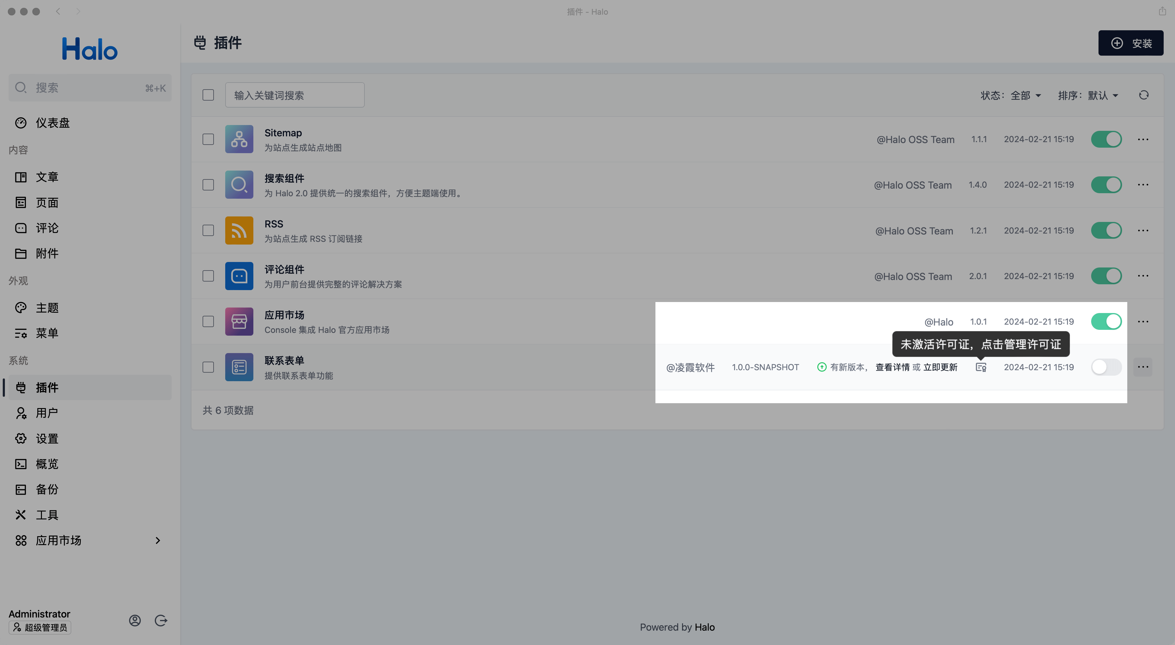 安装前置要求Halo 版本需要大于等于 2.10.0因为此插件适配了应用市场的许可证机制,需要激活许可证才能正常使用,所以必须要安装 应用市场 插件的最新版本,并绑定 Halo 官网的账号。安装在 应用市场 购买。如果你网站内置的应用市场已经绑定 Halo 官网,可以直接在后台进行安装,或者参考 安装插件 手动安装。安装完成之后即可在插件管理中看到该插件,首先需要激活许可证,然后启动即可。