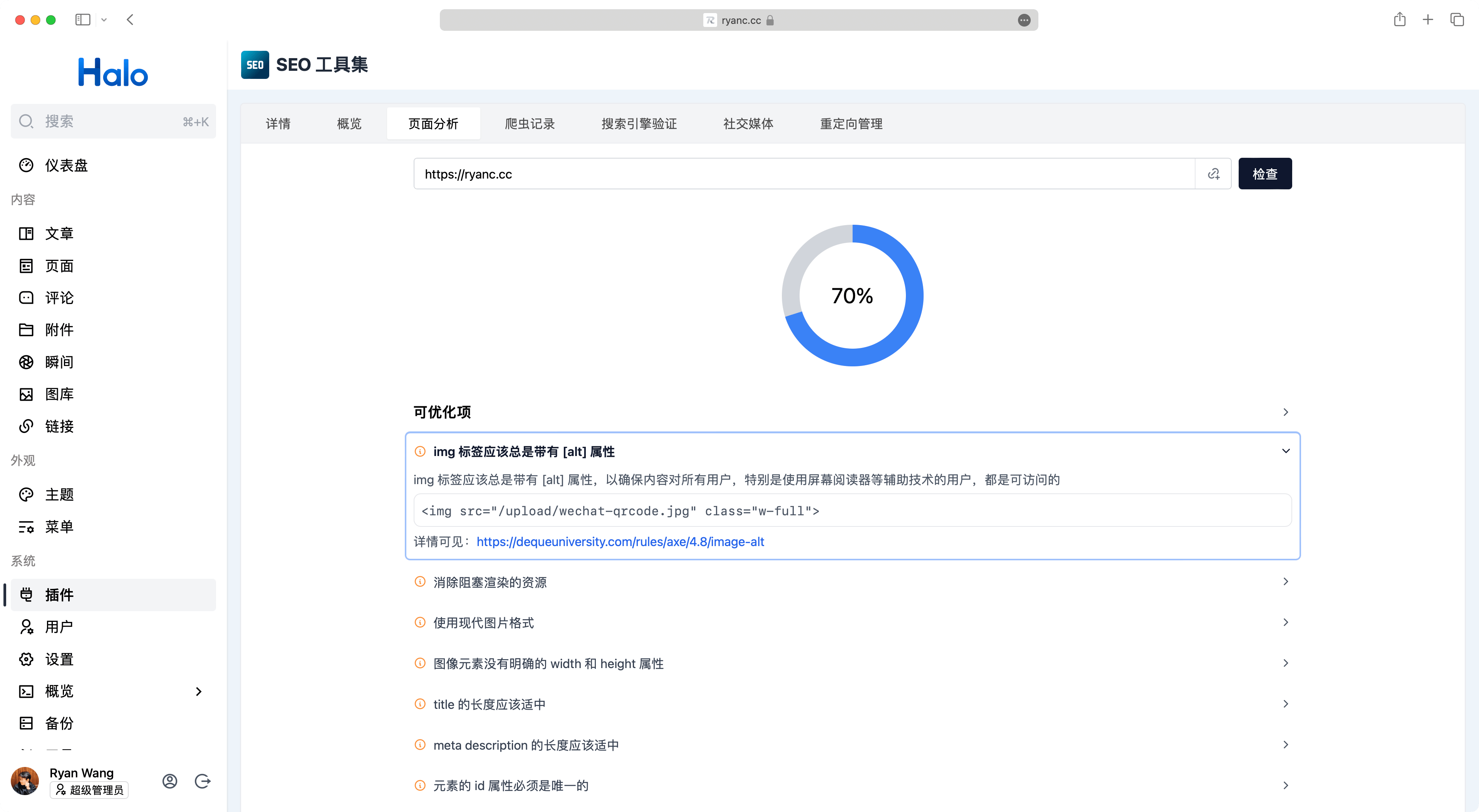 此页面用于分析具体页面的情况,可以检查出网站对于 SEO 相关的一些可优化项。