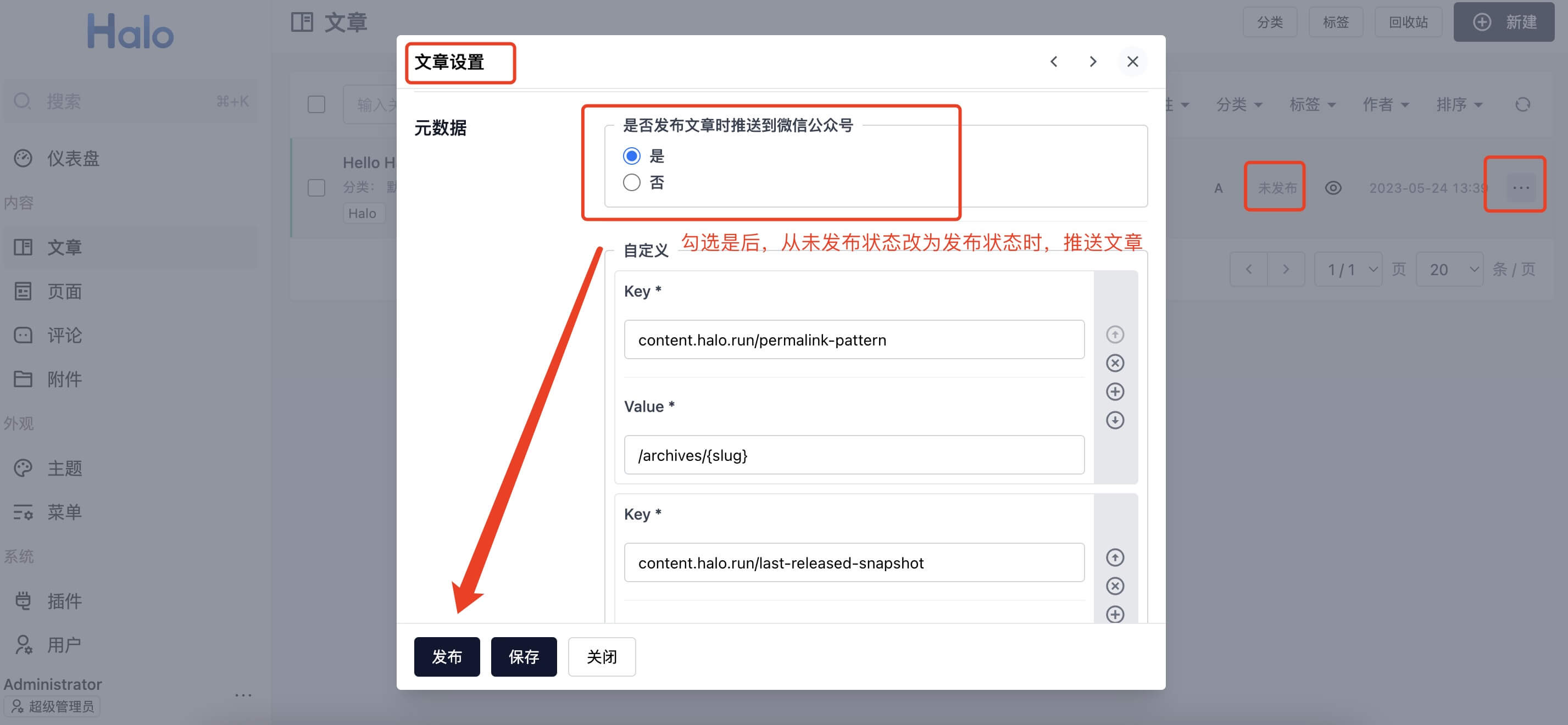 可以在文章列表右边操作处选择「同步到微信公众号」,选择确认,即可将文章同步到微信公众号。稍等片刻刷新 Halo 的页面即可查看同步的状态以及可能的错误提示。