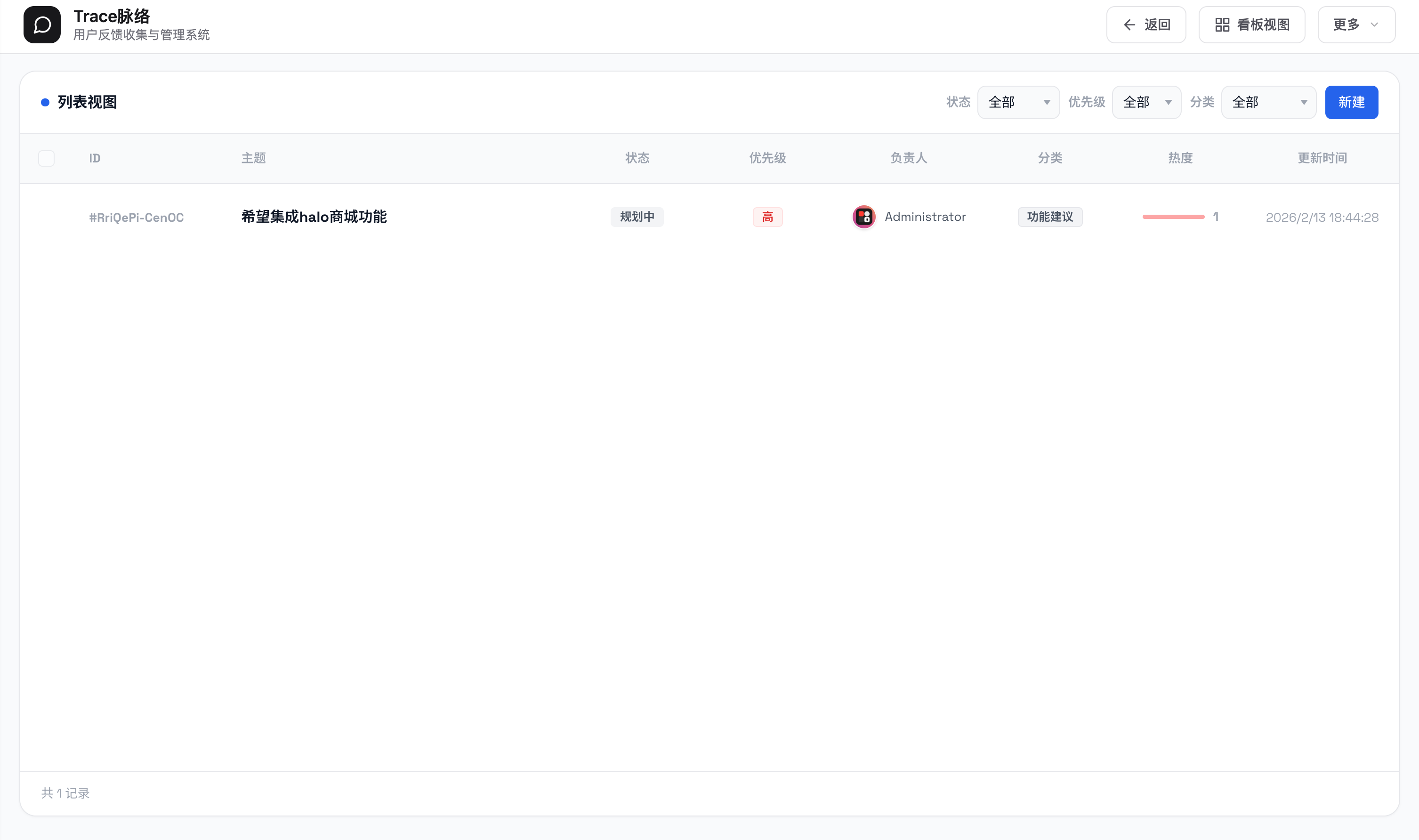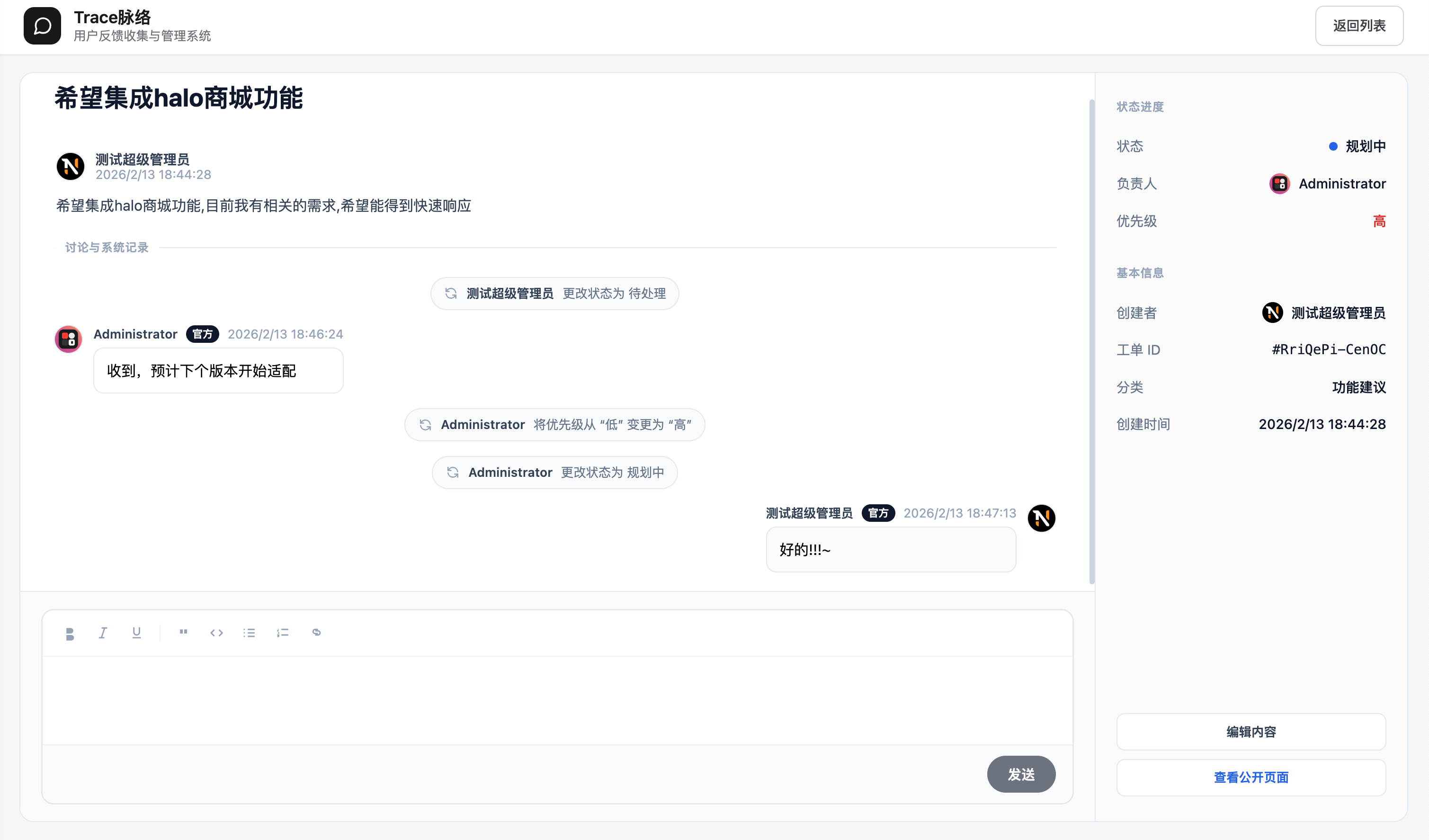 - 即时互动的详情页:清晰展示评论互动与系统状态变更记录,信息流转一目了然。