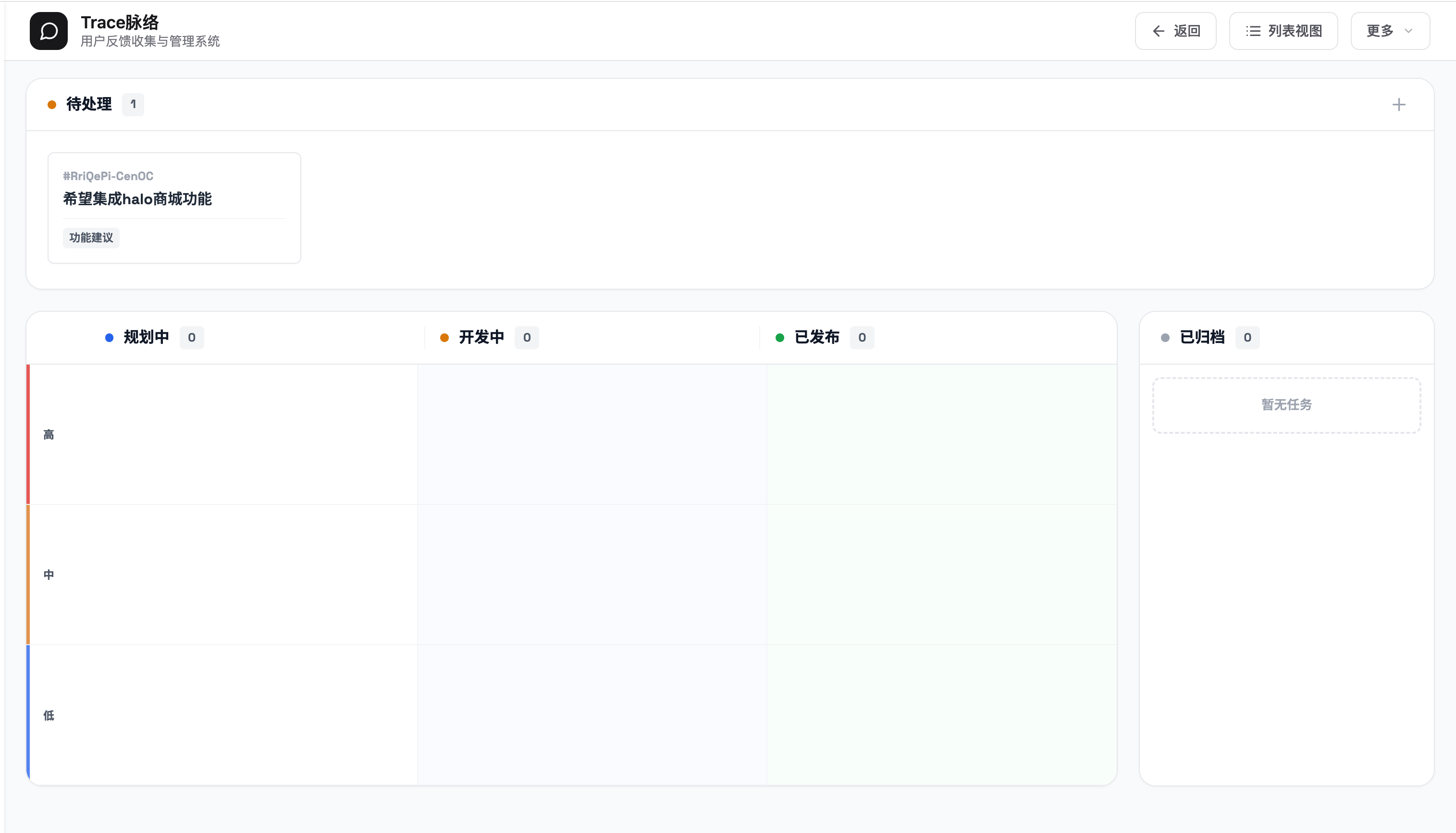 - 自定义工作流:支持配置符合团队习惯的状态流转体系(如:待评估 → 规划中 → 开发中 → 已发布),灵活适配敏捷开发流程。