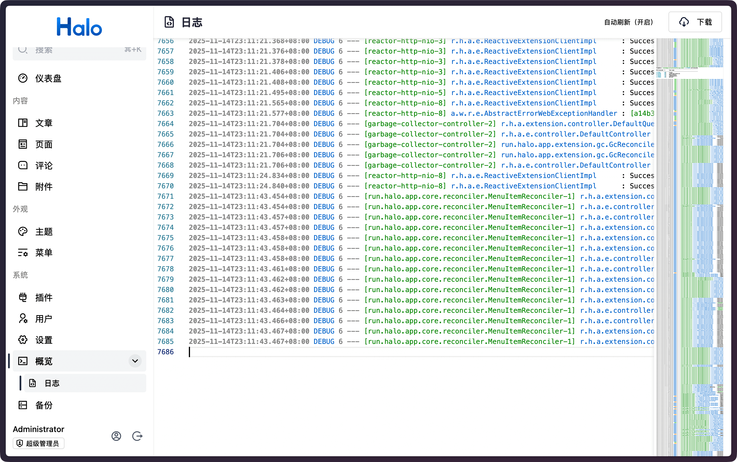 Log Viewer 在线查看 Halo 运行日志 使用 在 Halo 应用市场 或者 Release 中下载并安装 进入概览 -> 日志页面即可查看日志 开发 git clone https://github.com/ruibaby/plugin-log-viewer && cd plugin-log-viewer ./gradlew haloServer