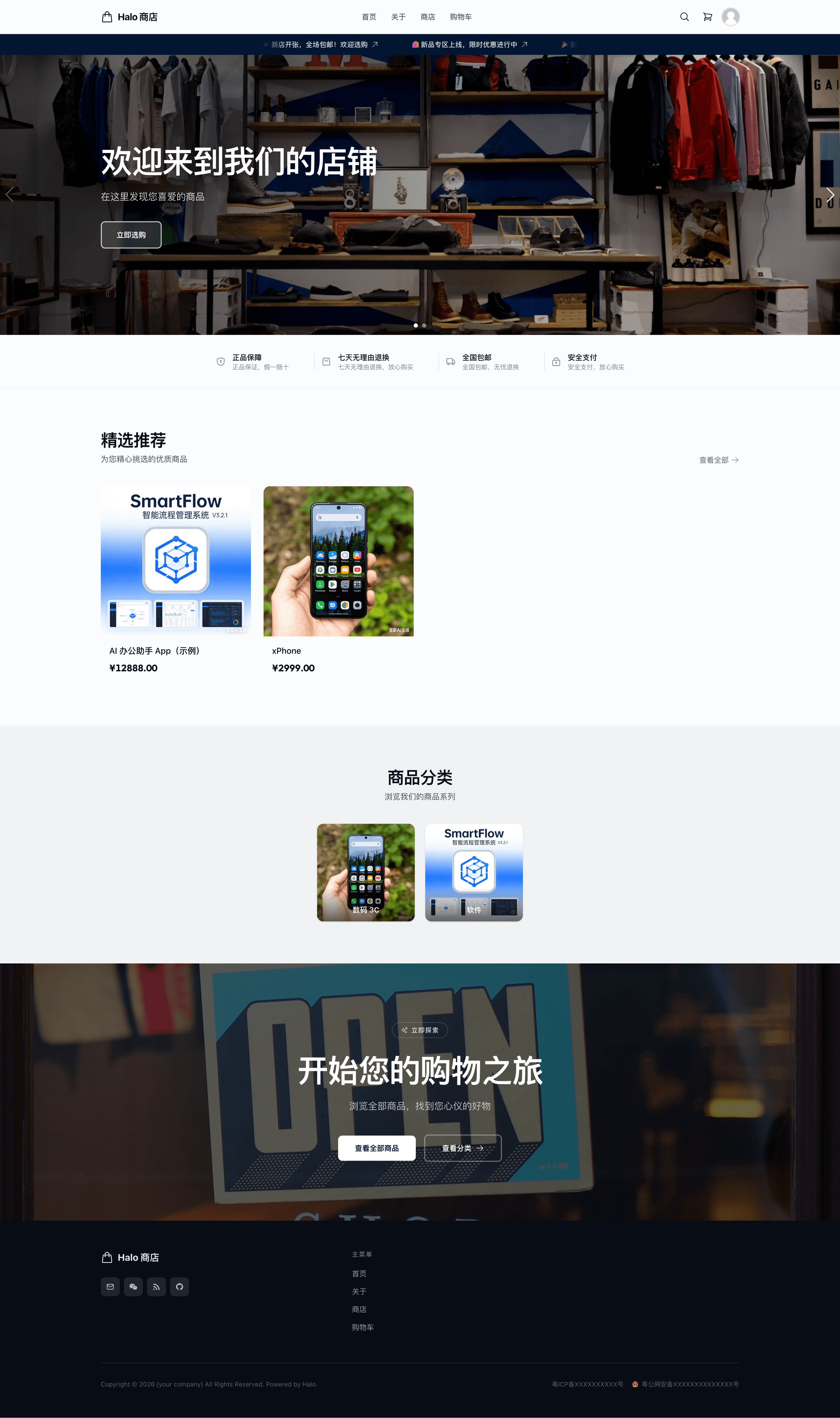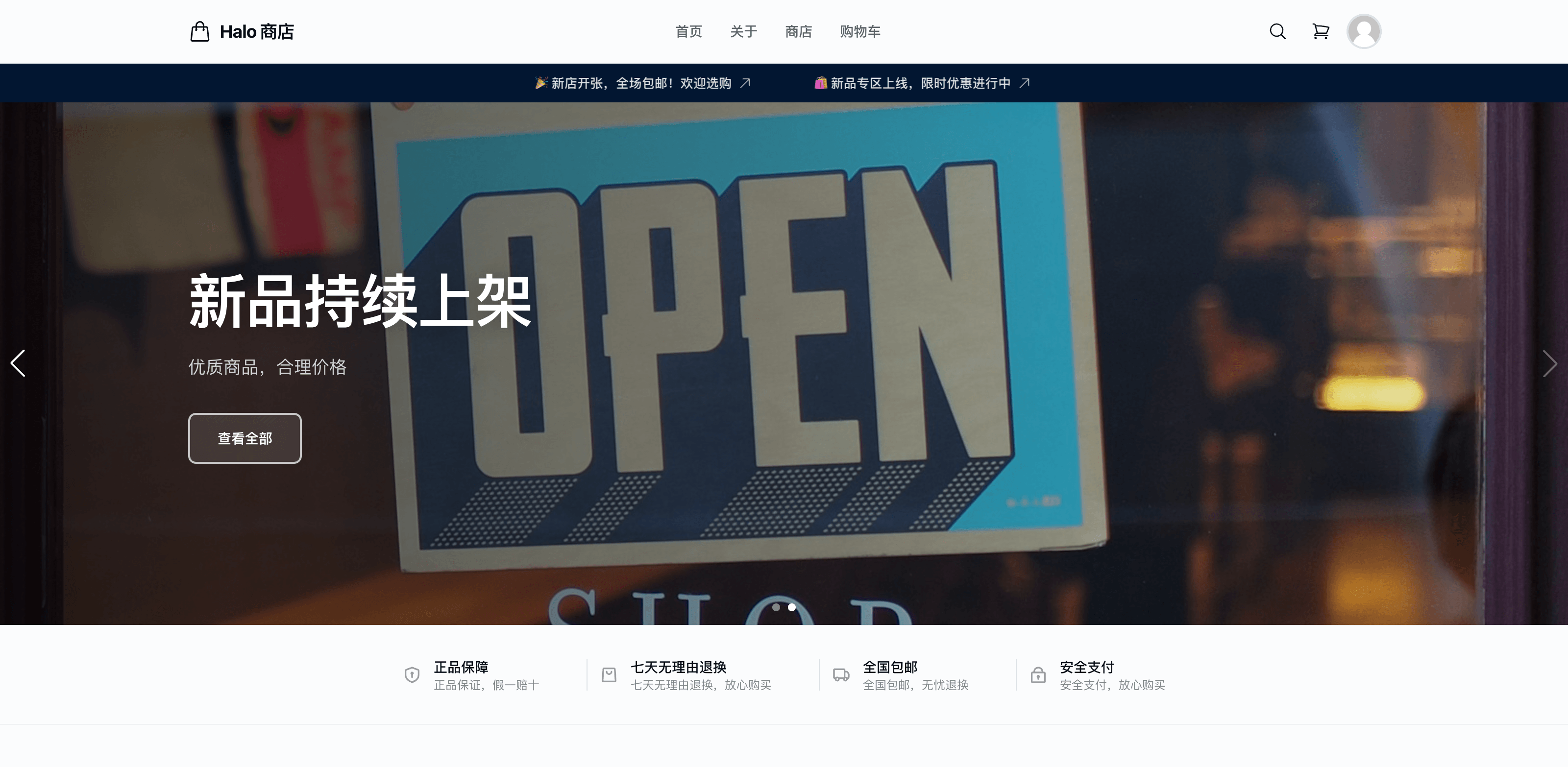 Cartly 是一款面向 Halo 商城场景的现代化主题,适合品牌官网、内容电商和独立店铺。它提供完整的商城页面流程,同时保留内容站点所需的文章、分类、标签等能力。
